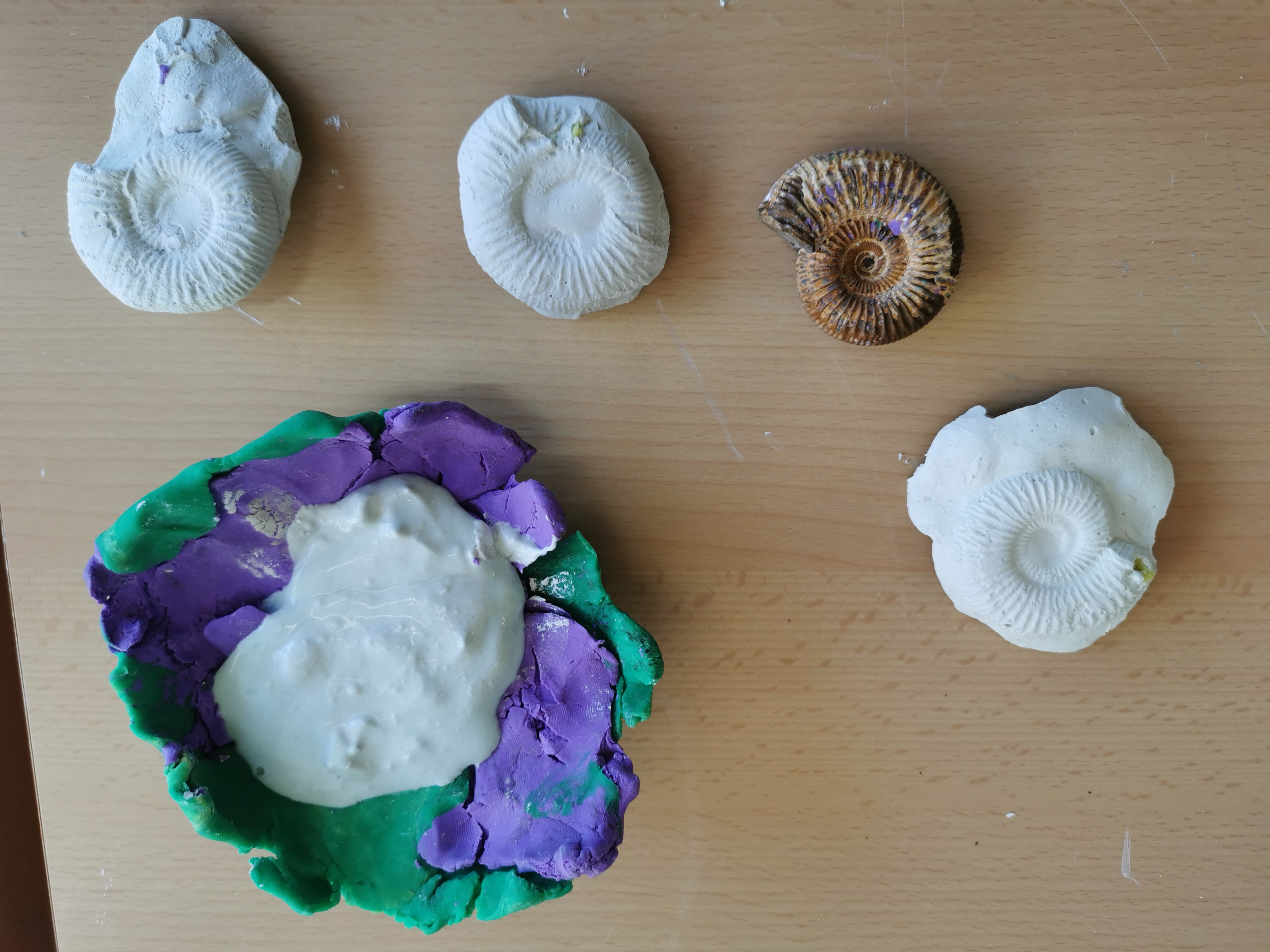 Outras veces, os fósiles son seres vivos que quedaron enterrados e, co paso do tempo, convírtense en rocha. Aprendimos a construir os nosos propios fósiles! Para elo creamos unha pasta de escaiola e vertémola sobre un molde de plastilina con forma de fósil auténtico: